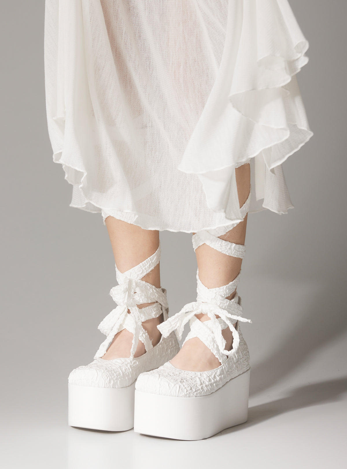 The Irori is a gorgeous ballerina platform with multiple wide ribbons to wrap around your calf and ankle. The material has a rippled texture which resembles a once-placid lake disturbed by a whispering breeze. The platform measures 2.5" at the front to 3" at the heel.
