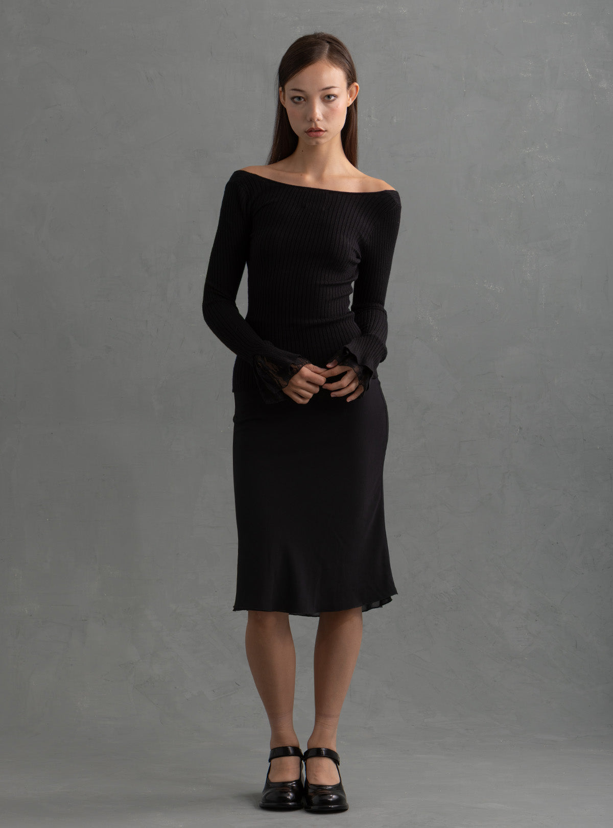 Elegant ribbed top with an almost off-shoulder neckline. intricate lace flair cuffs and a deep-V back. Material is soft and stretchy that hugs the body well. Minimalist with a touch of romantic elegance.