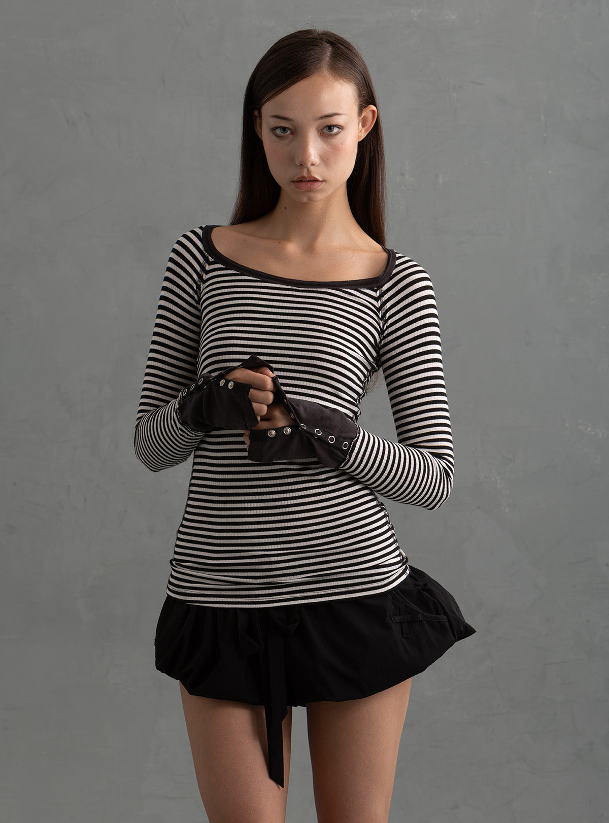 Y2K inspired long sleeve. white and black striped scoop neck T-shirt. Super soft material with raw rolled edge detailing on the neck. cuffs. cuff trim. etc (which will naturally fray). Reverse stitching on the side seams and snap tape for opening up the cuffs. Paired with the Svet Skirt coming back in stock soon.
