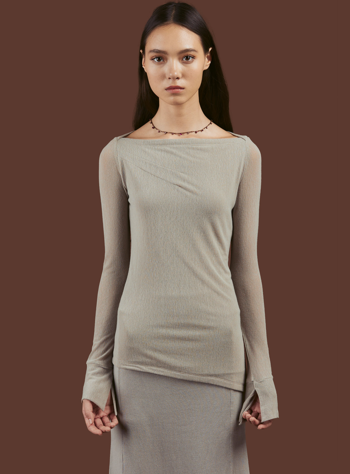 The Nexus Top is a mesh long sleeve knit top with a wide-square neck. asymmetrical hem. and cuffs with slits. Comes in multiple colorways.