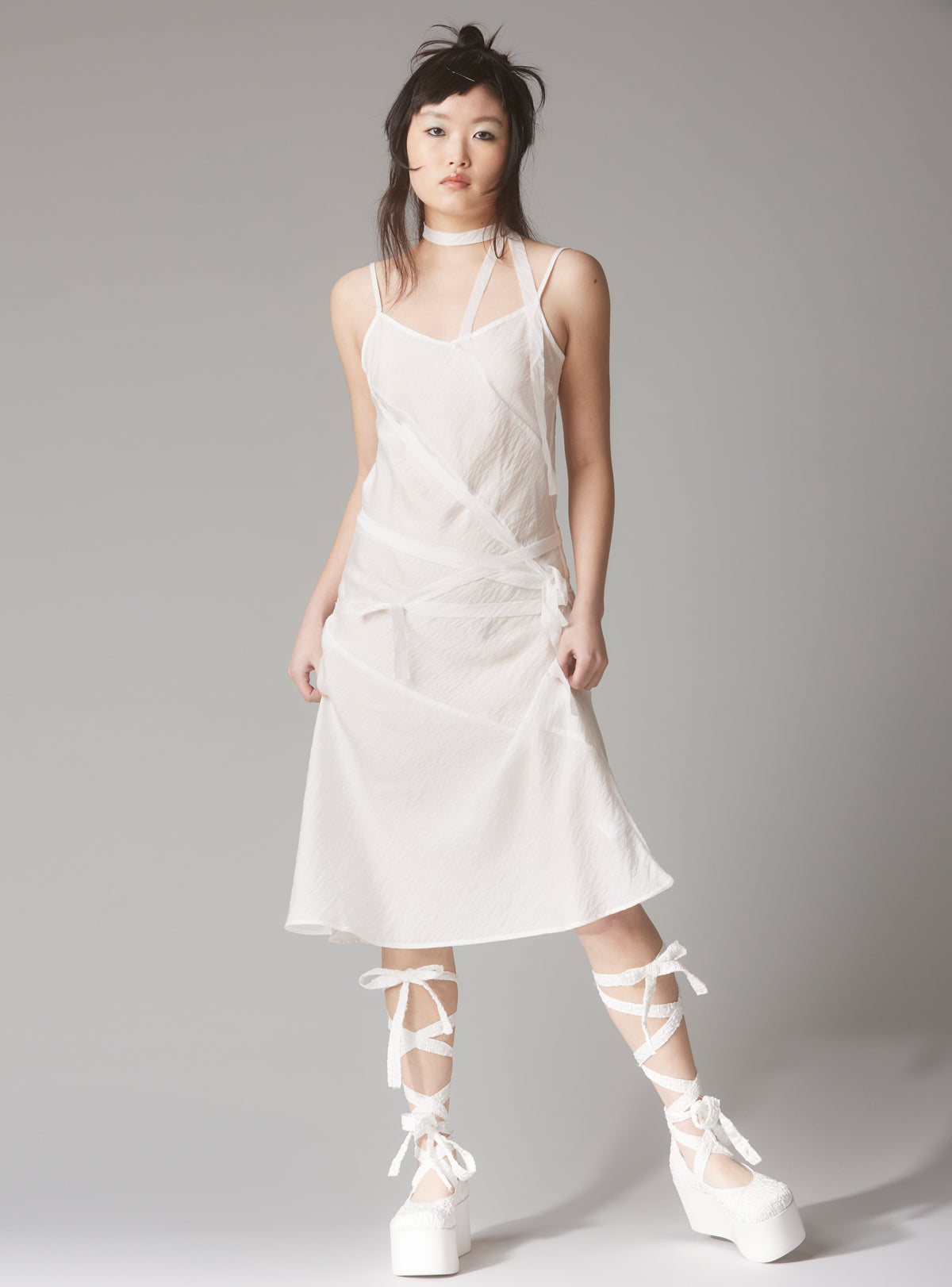 Simple slip dress with tailored seams and customizable straps. The slightly sheer material is a rayon/linen blend that has a light. and gauzy texture to it.
